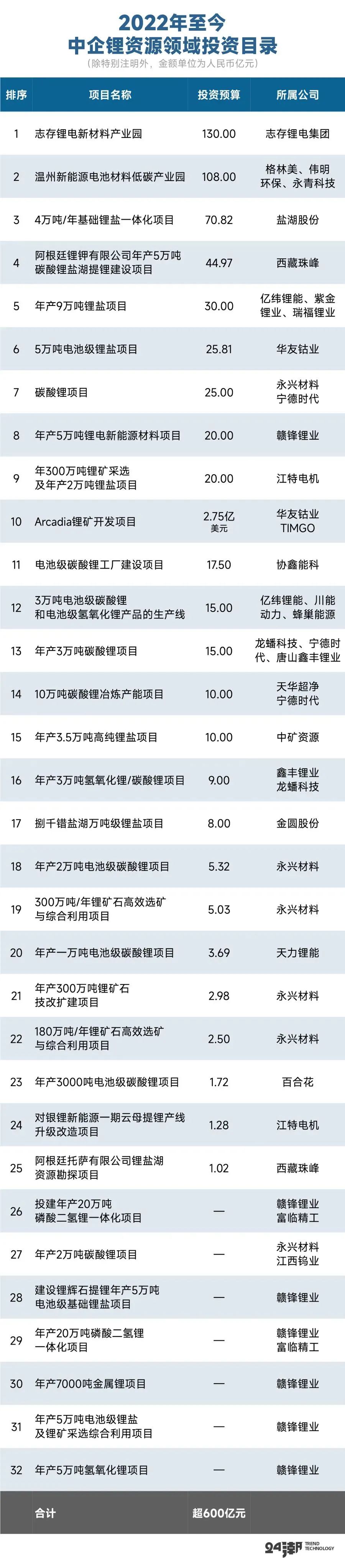 此外,2022年至今中资企业至少对外发布了32个重大锂资源投资公告,总投资超600亿元。