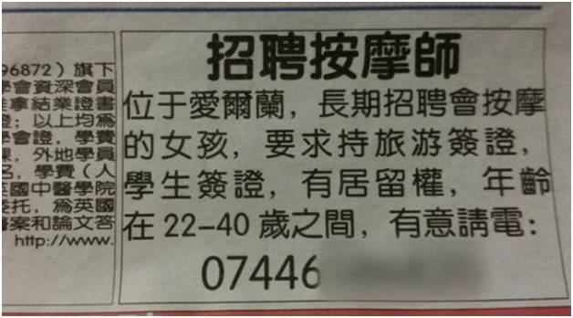 之后,张女士才知道老板经营的是一家提供性服务的按摩场所,她身边的“同事们”几乎都是被此类“家庭保姆”、“正规按摩院招人”甚至“办公文员”的招聘贴给吸引过来的。在按摩店里,张女士每天平均接客4、5人。每小时收费60美元,老板拿走40、45美元,工人挣15到20美元。如果是每小时收120美元,老板和按摩女一人一半。