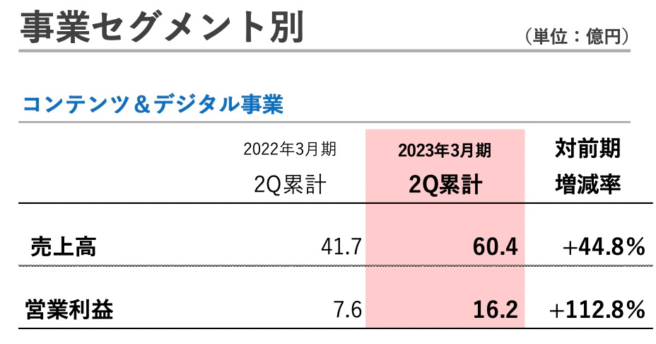 综合看来,该业务板块在2022年二三季度的业绩增长情况为:销售额达到60.46亿日元,环比增长44.8%;营业利润达到16.23亿日元,同比增长112.8%。