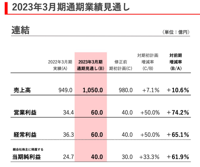 根据圆谷对于今后业绩的预期可以得知,其预计在2023年3月时实现以下四项指标的达成:销售额达到1050亿日元(折合人民币约52.8亿元)、同比增长7.1%;归属于母公司股东的季度净利润达到40亿日元(折合人民币约2.01亿元),同比增长33.3%。