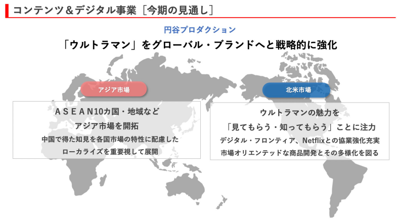 此外,针对北美市场,圆谷指出,要强化充实与Digital Frontier及Netflix在业务上的协作等,以提高“奥特曼”品牌的知名度;要全力致力于让“奥特曼”的魅力为北美市场受众所感、所知,切实提升品牌力,并以面向市场的商品开发和多样化为目标,进一步提高其成长力。