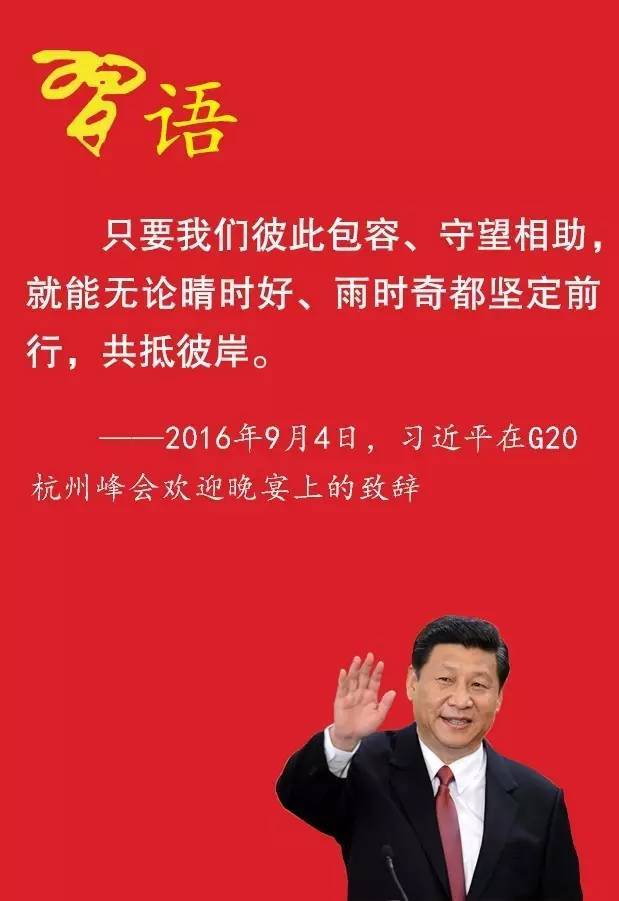 在B20峰会开幕式演讲结束时,习近平说:这几天正值钱塘江大潮,中国有个诗句,叫“弄潮儿向涛头立。手把红旗旗不湿”。我同各位一样,期待着二十国集团勇做世界经济的弄潮儿。