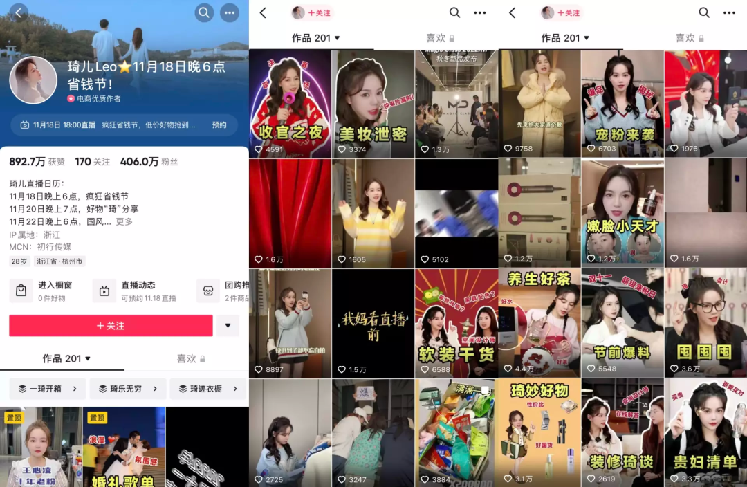 琦儿树立的人设为“好物推荐官”,通过视频内容传递美妆、美食、服装、母婴、家居等不同类目的直播种草,且目前开始运营抖音矩阵号,推测后期会开启多号矩阵直播。