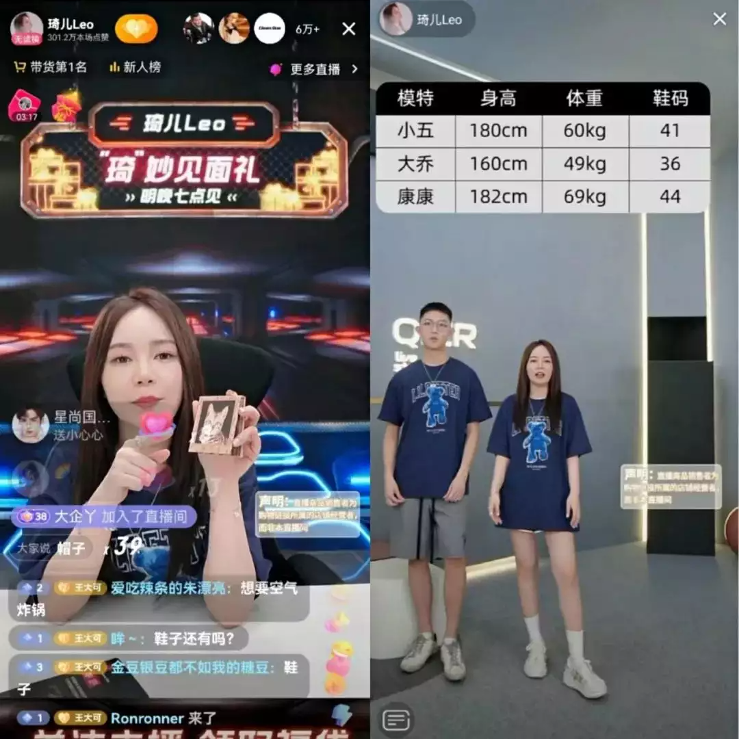 琦儿直播间几乎复制了薇娅直播间的模式,主播+助播,带服饰品类时镜头切到旁边场域,有专门的模特试穿。