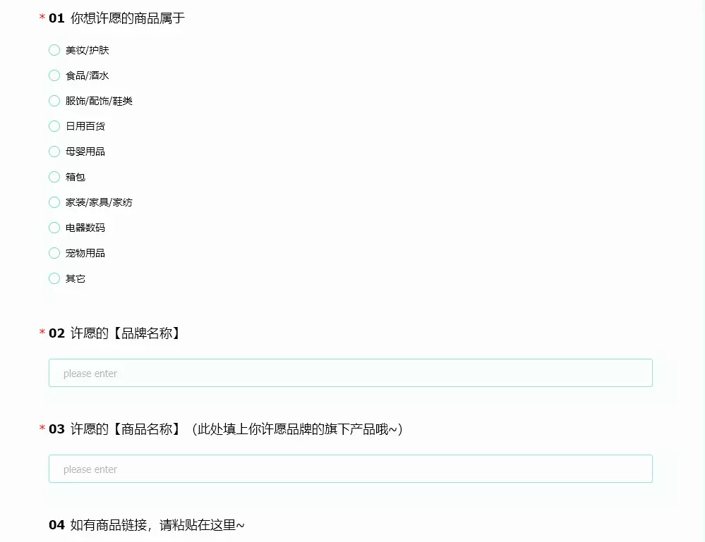 琦儿的公众号及助理会定期向用户推送心愿单,用户有什么想要的商品可以通过问卷进行反馈,其范围覆盖全品类,用户甚至还以上传自己想要的产品链接。这样既方便团队选品、筛品,也能保证用户在直播间能够买到想要的商品,提升转化率。