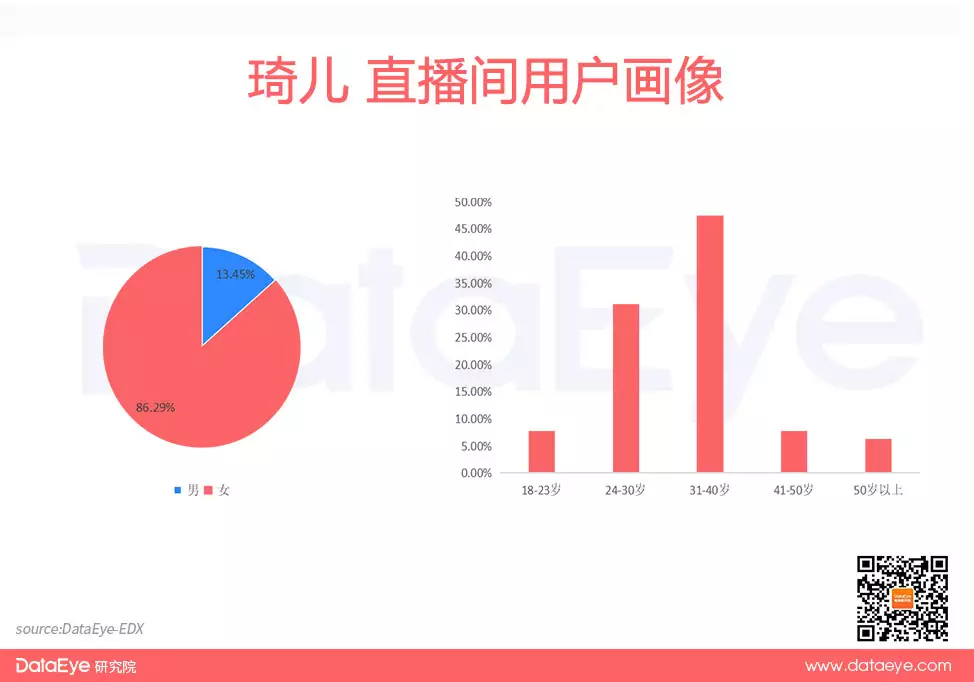 根据数据显示,琦儿直播间粉丝女性占比高达86%,31-40岁用户占比达47.33%,24-30岁用户占31.05%,用户主要分布在上海、北京、杭州等一线及新一线城市。该群体用户多以工作多年,已结婚甚至有孩子,拥有职场女性和孩子妈妈双重身份,追求性价比也有极强的消费力。