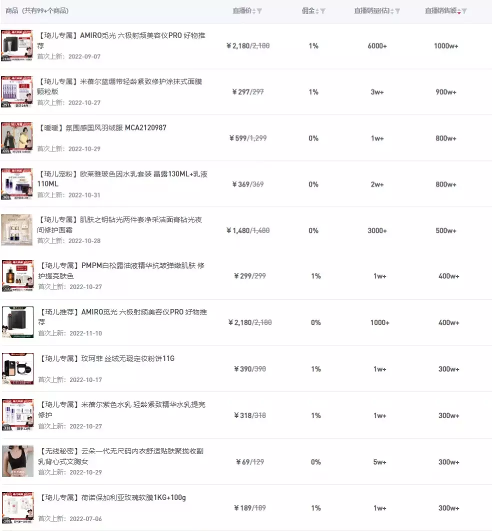 近30天内,直播间销售额超过300W的有12件单品,83%以上的单品客单价在200元以上;值得关注的是“AMIRO美容仪”单价高达2000+元,销售额破千万,直播间用户的消费力可见一斑。