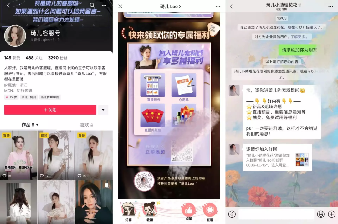 除此之外,琦儿相较于其他头部主播,更注重私域这一环。先通过抖音简介、视频内容在公域引流 ,然后导入抖音粉丝群,在直播中进行转化,再通过售后客服、微信公众号、助理企信等途径将用户沉淀到粉丝社群和私域流量池,最后培育忠实用户在直播间复购,形成一个正向循环: