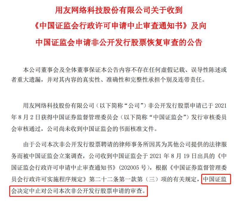 屋漏偏逢连夜雨。由于用友网络此次定增聘请的律师事务所因其为其他公司提供的法律服务而被证监会立案调查,2021年8月,证监会决定中止对公司此次定增申请的审查。