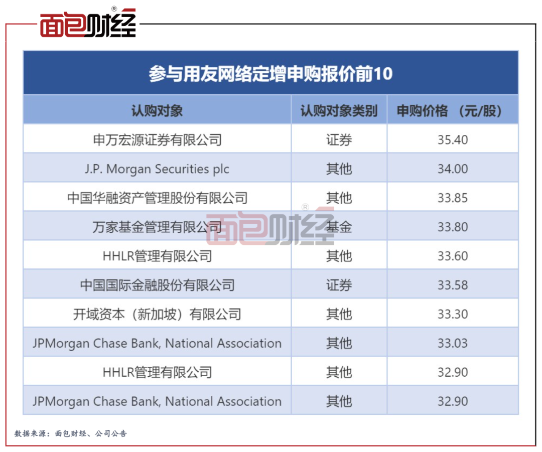 包括中金公司、申万宏源、万家基金在内,多家机构参与此次定增。公告显示,用友网络此次共收到23单申购报价单,涵盖43个申购报价,43个申购报价平均值31.7元/股,中位数32元/股。