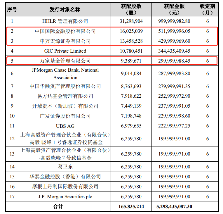 境内大型投资者中,中金公司、申万宏源、万家基金最终获配金额较多,获配金额在17名发行对象中排在前五位。
