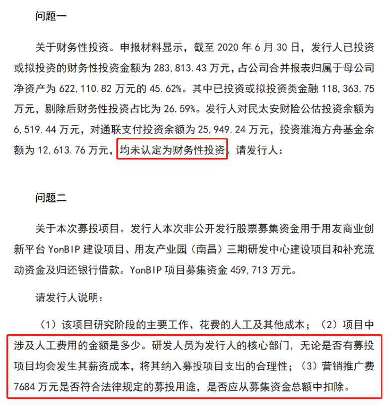 定增预案披露一年多以后,2021年7月用友网络发公告称,收到证监会下发“告知函”。证监会就公司此次定增发问,一是关于公司部分投资未认定为“财务性投资”的原因;二是质疑公司部分募投项目支出、募投用途是否合理。