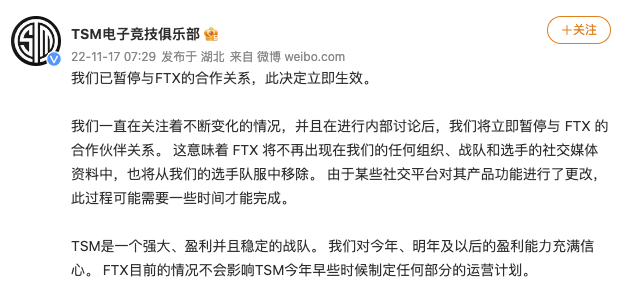 11月17日,TSM电子竞技俱乐部通过官博宣布,已暂停与FTX的合作关系,此决定立即生效。FTX目前的情况不会影响TSM今年早些时候制定任何部分的运营计划。该俱乐部表示,这意味着FTX将不再出现在他们的任何组织、战队和选手的社交媒体资料中,也将从他们的选手队服中移除。由于某些社交平台对其产品功能进行了更改,此过程可能需要一些时间才能完成。