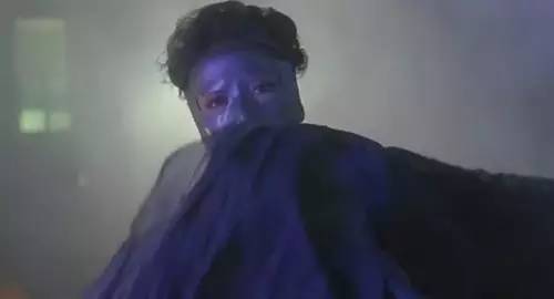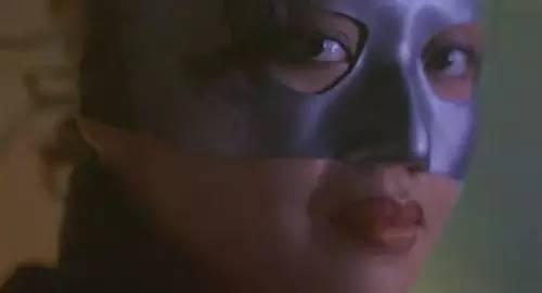 一出场,一组仰拍的镜头缓缓拉近,银灰色的假面,藏青色的披风,深蓝的衣饰和曼丽的红唇,利落的身手和凛然的气场,冷冽,潇洒,东东代表的是东方女性的独立。