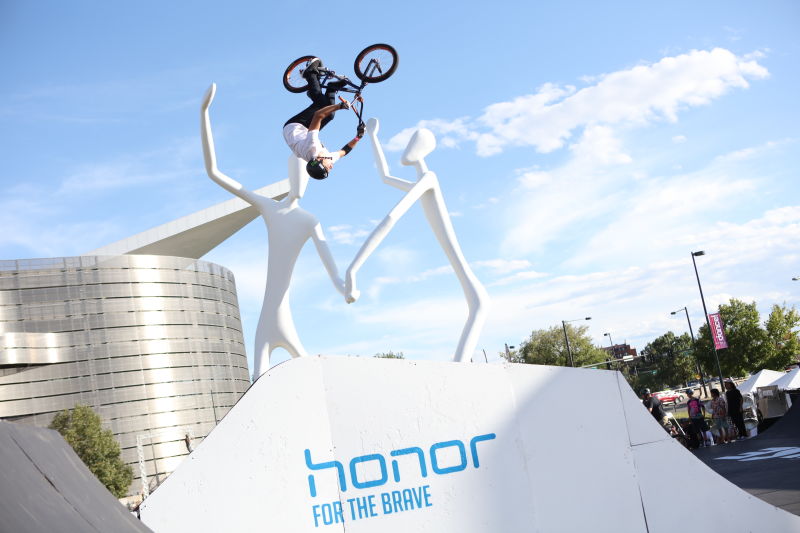 在9月3日到5日这个美国劳动假期中,上万人聚集到了落基山脉旁的高原城市丹佛,观看一场极限运动比赛。在比赛场地上,人们可以看到大大的Honor (荣耀的英文名)以及品牌口号For the Brave。