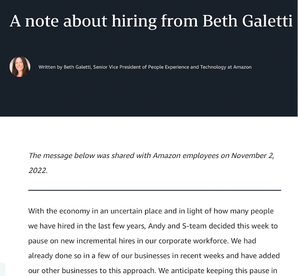 亚马逊高管贝丝·加莱蒂(Beth Galetti)在给员工的一份关于招聘冻结的说明中写道,“一般来说,根据公司的业务或领域,我们会雇佣回填人员来取代那些转向新机会的员工,并且有一些有针对性的地方我们将继续逐步招聘人员。”