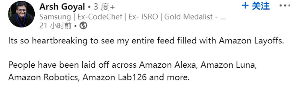 Arsh Goyal称,亚马逊的Alexa部门、Luna云游戏部门、Robotics部门、Lab126部门都被裁员波及。