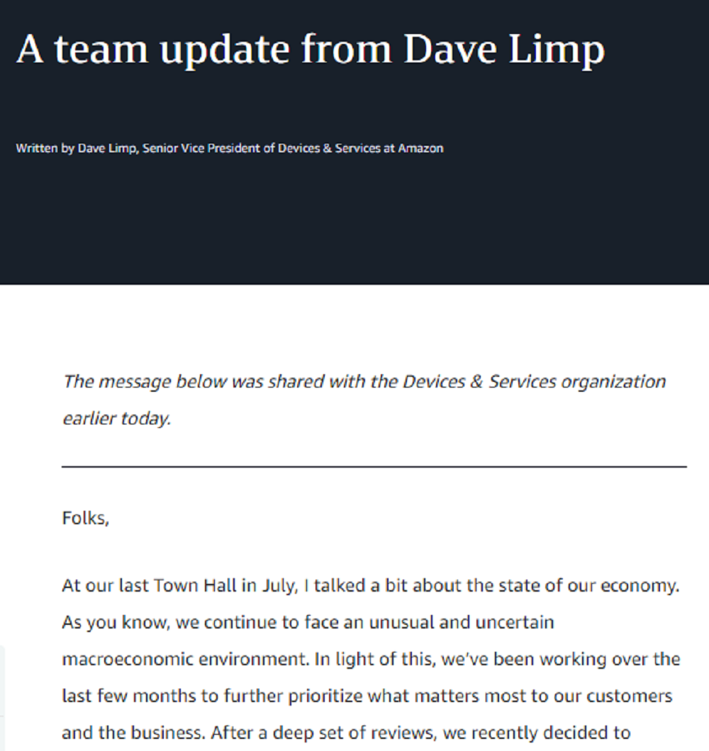 今天,亚马逊的设备和服务部门的负责人戴夫·林普(Dave Limp)在亚马逊博客中发布备忘录,正式对裁员消息作出回应。