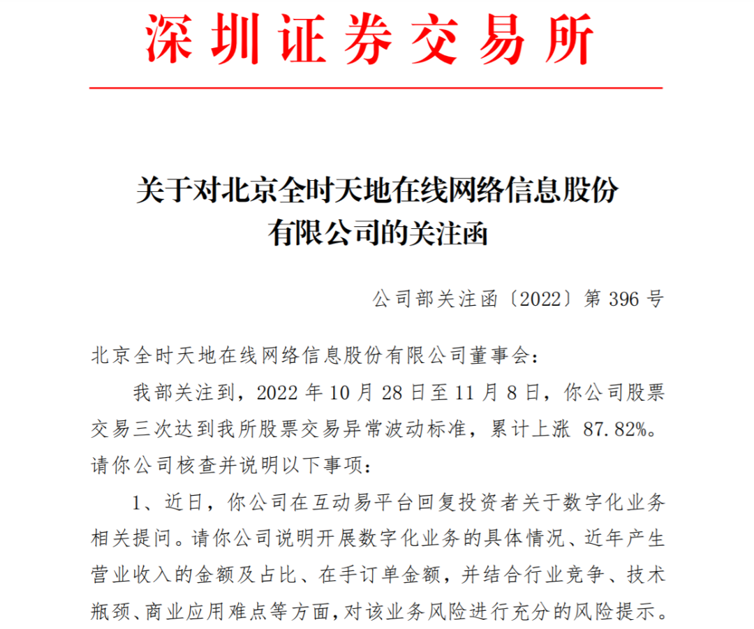 也正是因为令人咋舌的涨幅,让深交所于11月8日向天地在线出具了《关注函》。