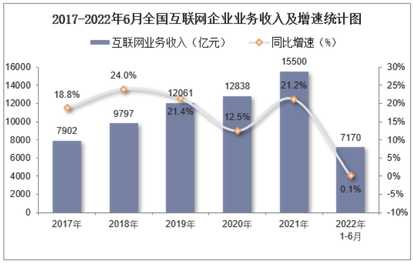 根据华经产业研究院的报告,2022年上半年,全国规模以上互联网和相关服务企业(以下简称互联网企业)完成互联网业务收入7170亿元,同比增长0.1%,增速与2021年相比,下滑了20%。