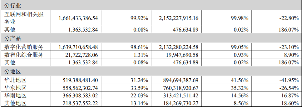 半年报显示,互联网和相关业务营收16.61亿元,营收占比为99.92%,其中数字化营销服务营收16.40亿元,天地在线是一家典型的互联网营销企业。