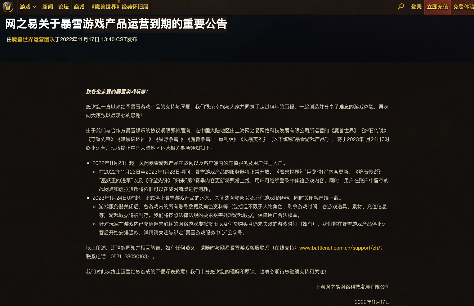11月17日,上海网之易网络科技发展有限公司发布公告称,由于公司与合作方暴雪娱乐的协议期限即将届满,在中国大陆地区由公司所运营的《魔兽世界》《炉石传说》《守望先锋》《暗黑破坏神III》《星际争霸II》《魔兽争霸III:重制版》《风暴英雄》,将于2023年1月24日0时终止运营。