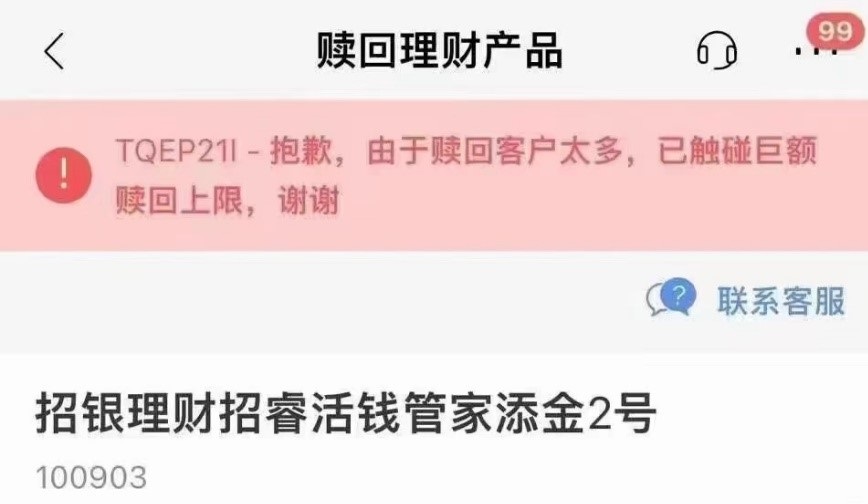 涉及产品包括招银理财发行的一款R2中低风险产品——招银理财招睿活钱管家添金2号。11月17日,该产品已可正常赎回。招商银行理财经理向媒体解释称,发生大额赎回是由于赎回该产品的客户太多,达到了系统限制的比例。