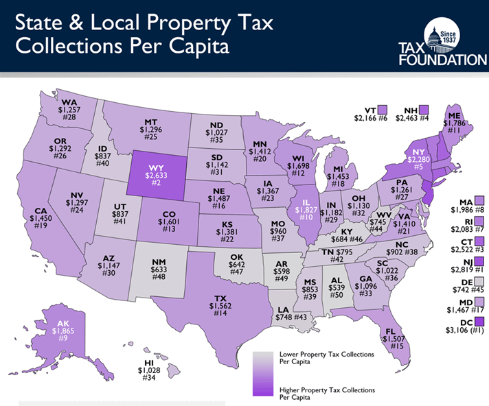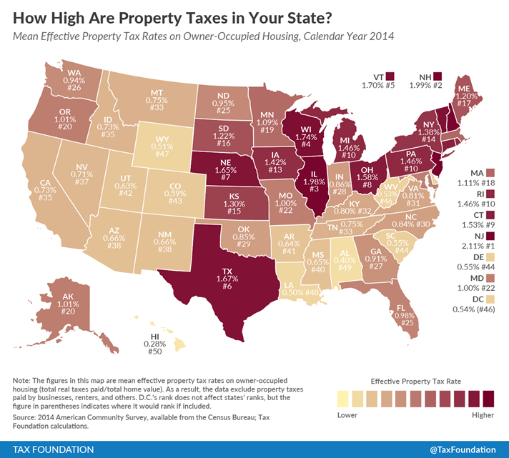 图为美国各州和地区的房产税税率图,14年数据沿用至今