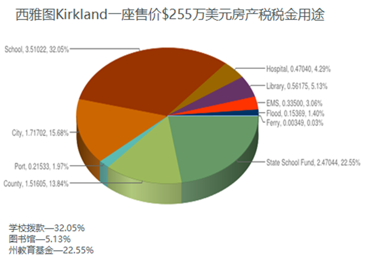 每年所缴纳的房产税很大一部分用于房产所在城市的基础设施建设和教育拨款,是负担却也是福利。如西雅图2014年交易的这处价值255万美元的房产,在2015年度缴纳的房产税中,有32.05%用于房产所在学区的学校拨款,5.13%用于图书馆,22.55%用于华盛顿州教育基金,也就是说约60%用于教育的直接或间接拨款,这也就难怪西雅图柯克兰的这所高中能名列全美公立高中前100名了。所以,房产税交的多,住在这里的居民能直接享受到的福利就好,这个区域的房产增值前景就好,从而形成良性循环。