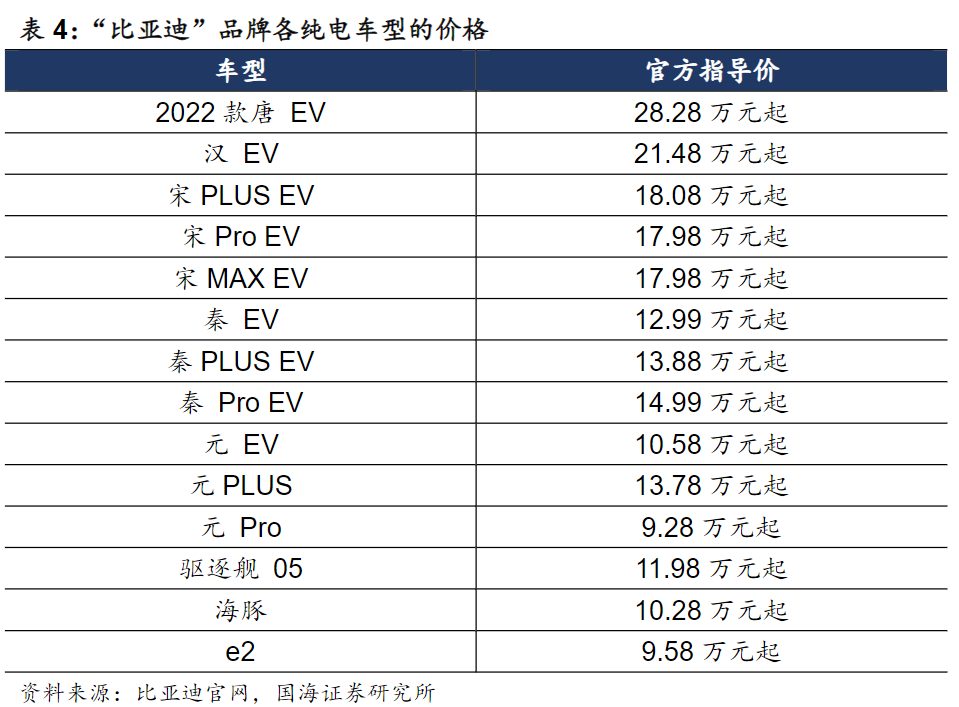 (比亚迪品牌各纯电车型的价格 图源:国海证券研究所)