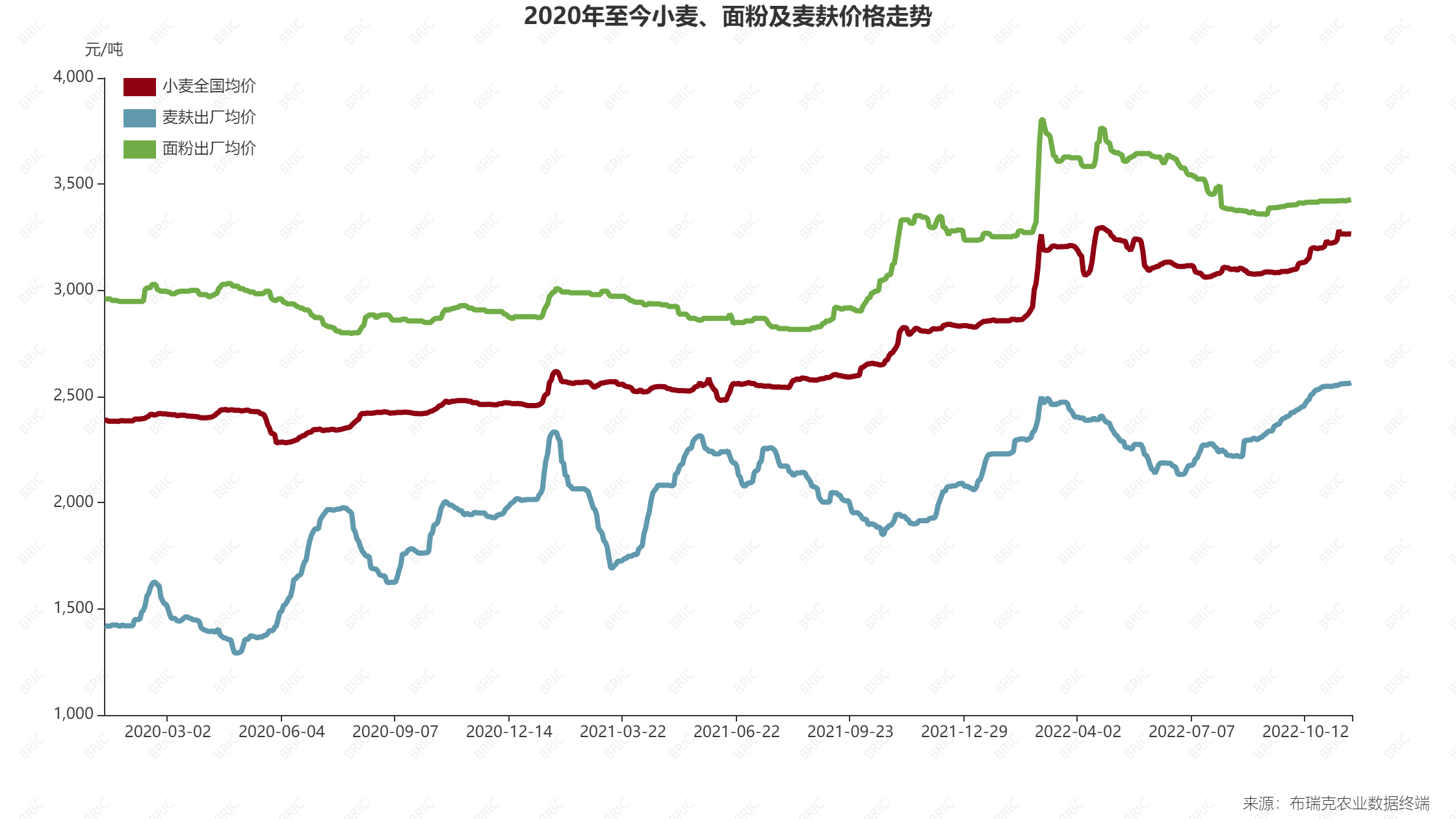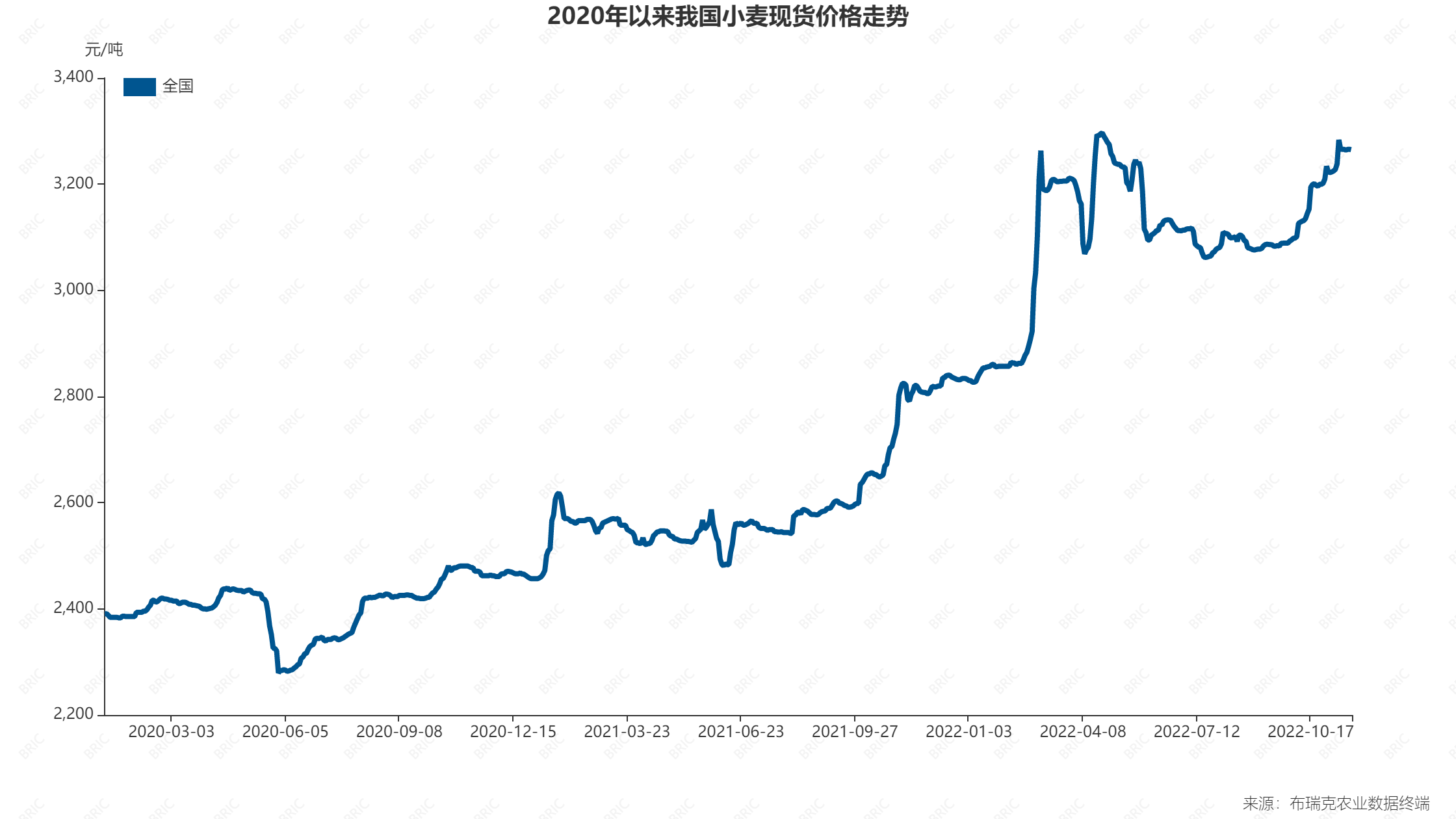 2021年第四季度开始,华北地区持续阴雨导致玉米收获延后,加上2020年下半年以来大量小麦用于饲料加工,库存下降,国内小麦价格大幅上涨,刷新历史最高价。