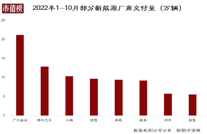 再将对比范围扩大一些,在新势力车企中,蔚来去年10月还是累计销量冠军,今年已经掉到第六名。今年前10个月,第一名广汽埃安的交付量,相当于2.3个蔚来,此前榜上无名的哪吒,也已经甩开蔚来1/3个身位。