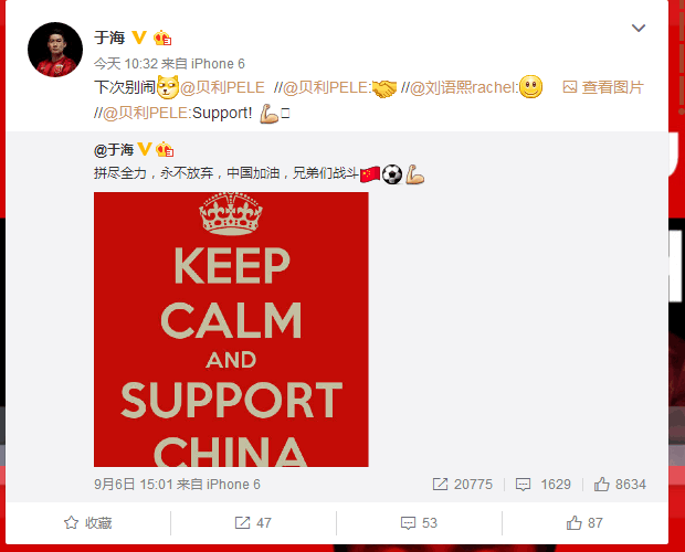 “下次别闹。”——在昨晚中国男足与伊朗的世预赛前,于海曾发布微博为自己以及国家队打气。这条微博也受到社会各界人士关注,其中点赞的不乏球王贝利以及前央视体育主持人刘语熙。