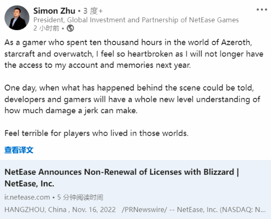 同时,就在今天下午,网易游戏全球投资与合作总裁Simon Zhu转发该消息时表示:有一天,当我们可以说出幕后发生的事情时,开发者和玩家将会对一个混蛋能造成多大的伤害有一个全新的理解。暗示此次无法续约是有人在幕后捣鬼。