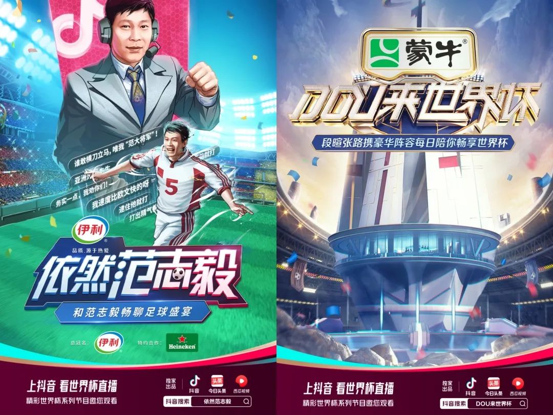这其中,广告界的两大“扛把子”自然不会缺席。蒙牛冠名了抖音每日世界杯观赛指南节目《DOU来世界杯》;伊利冠名了抖音足球脱口秀和趣味电竞游戏节目《依然范志毅》。