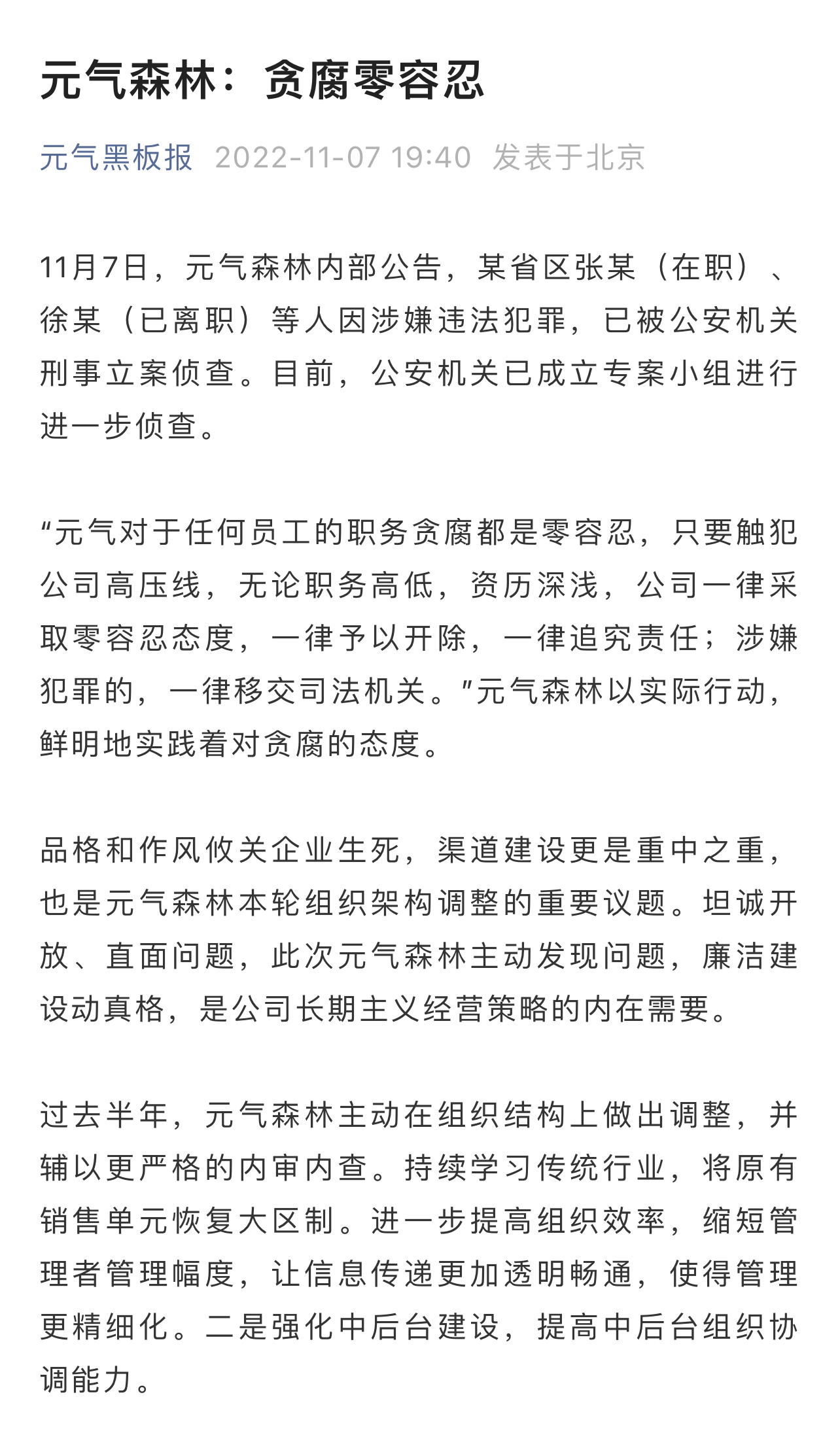 这要从元气森林11月7日的“高调反贪腐”说起。据该公司披露,元气森林某省区张某(在职)、徐某(已离职)等人因涉嫌违法犯罪,已被公安机关刑事立案侦查。目前,公安机关已成立专案小组进行进一步侦查。