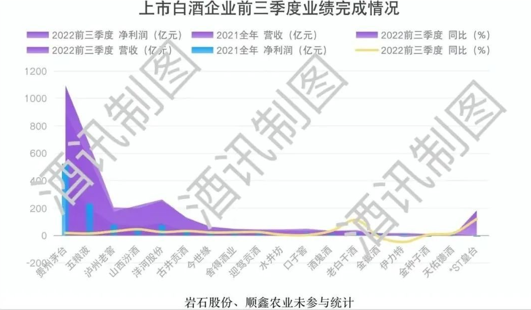 从酒讯智库梳理的资料来看,2022年前三季度,已有山西汾酒、洋河股份、今世缘、酒鬼酒、*ST皇台等5家酒企超过了去年全年的营收,这也就意味着,接下来只要不出大错,一张“增长”的业绩报表是不会跑了。