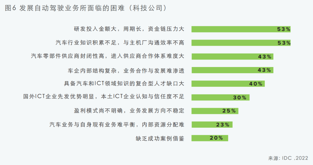 超过半数的科技公司认为研发投入金额大,周期长,资金链压力大。同时,对科技公司来说,汽车行业知识积累不足,与主机厂沟通效率不高。