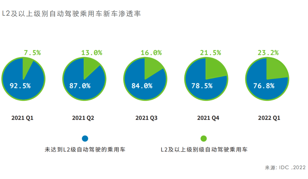 根据IDC《中国自动驾驶汽车市场数据追踪报告》数据,今年一季度L2级自动驾驶在乘用车市场的新车渗透率已达23.2%,而去年同期仅为7.5%。