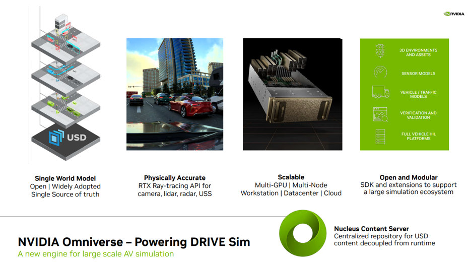 在仿真测试方面,英伟达基于Omniverse构建了自动驾驶汽车模拟器DRIVE Sim,可大规模地进行物理精准的传感器仿真。开发人员可以在工作站上运行可重复的仿真,然后在数据中心或云端扩展为批量模式。