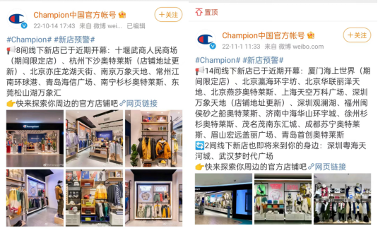 同时,虽然仍受疫情影响,Champion在国内仍在持续开店,品牌本身的影响力仍然受购物中心认可。今年下半年,Champion的新店就包括广东观澜湖新城MH mall、北京朝阳大悦城(F2)、北京龙湖亦庄天街、北京丽泽天地(F1)、广东茂名东汇城(F1围挡)、北京双安、西安钟楼开元店(G1)、上海百胜优客城市广场(F1)、北京顺义新世界百货、龙湖西安香醍天街、东莞南城汇一城等门店,且在楼层上,也多是一层或者B1客流量和曝光量较大的楼层。