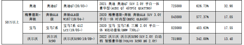 在用户关注的50万元以上的豪华品牌分类,品牌间零整比系数差异较为明显。其中,奥迪Q7零整比指数最高,达到626.73%,奔驰GLE和宝马7系的汽车零整比指数则分别为577.37%和483.63%,而沃尔沃XC90的指数最低,为342%。