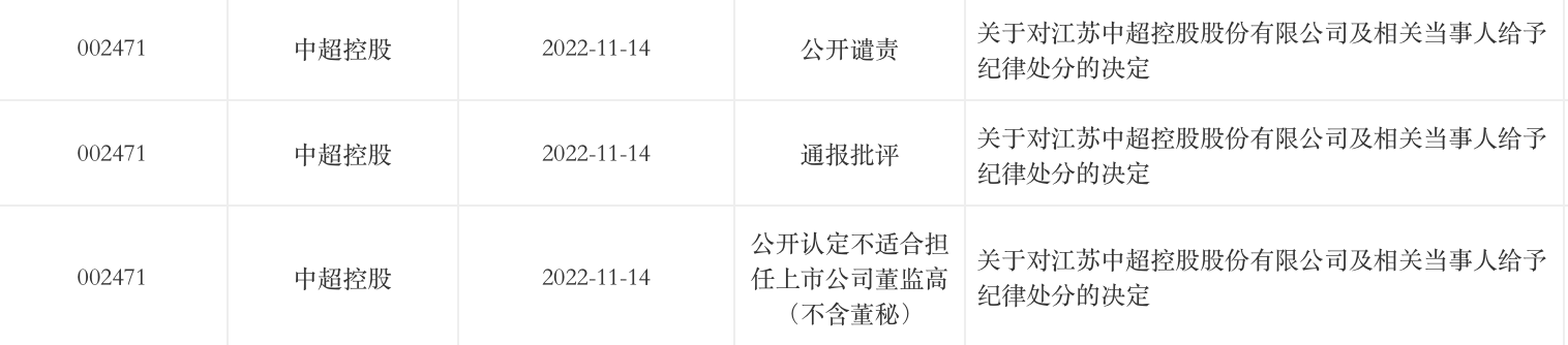 又是公开谴责,又是通报批评,又被公开认定不适合担任上市公司董监高,中超控股(002471.SZ)近期收到的处分名单有点长。