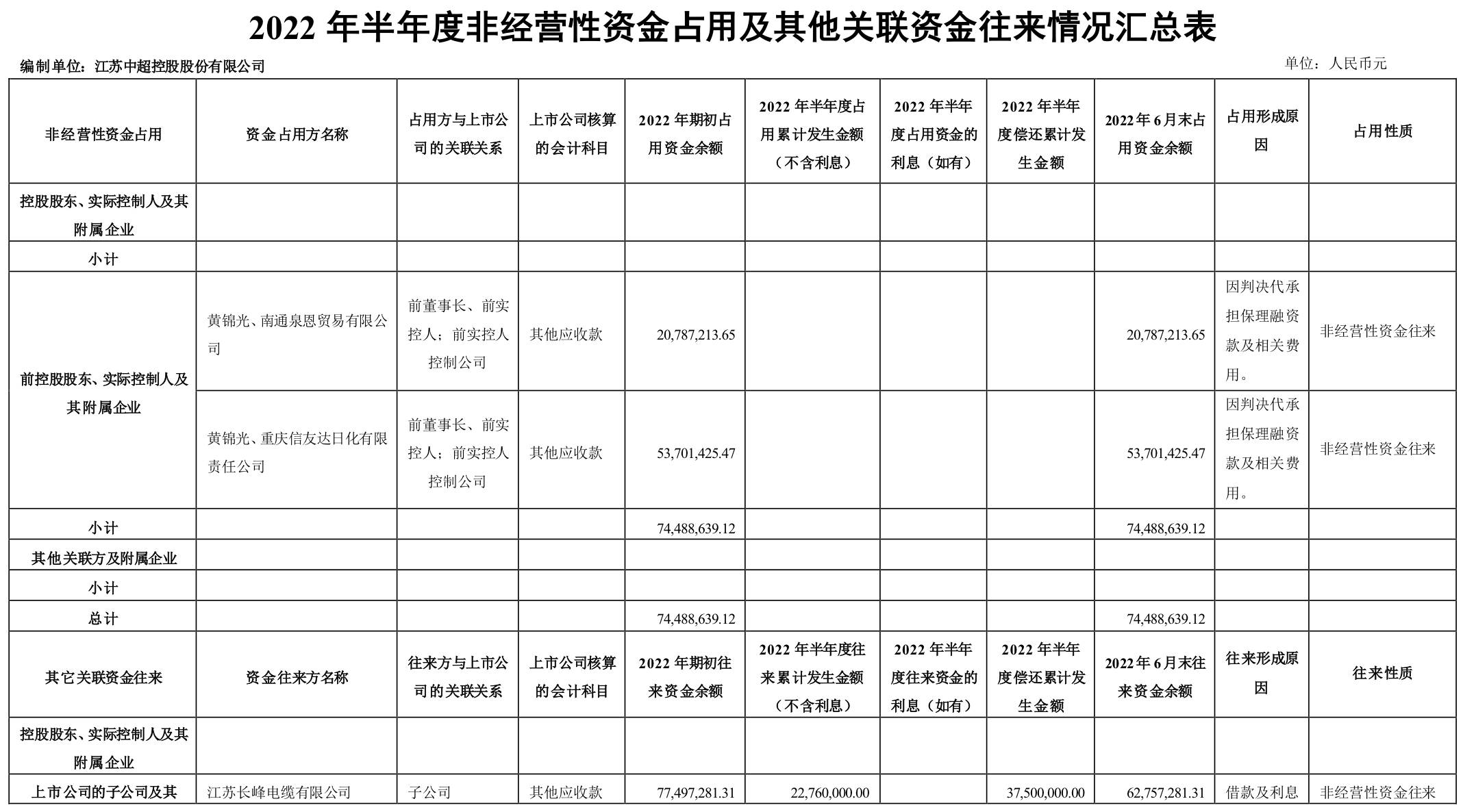 上述资金划拨构成黄锦光对中超控股非经营性资金占用。甚至,2018年9月和2019年4月,中超控股因上述保理业务被京华山一和海尔保理分别提起民事诉讼,中超控股还代黄锦光承担保理款本金、利息、律师费等合计7448.86万元。