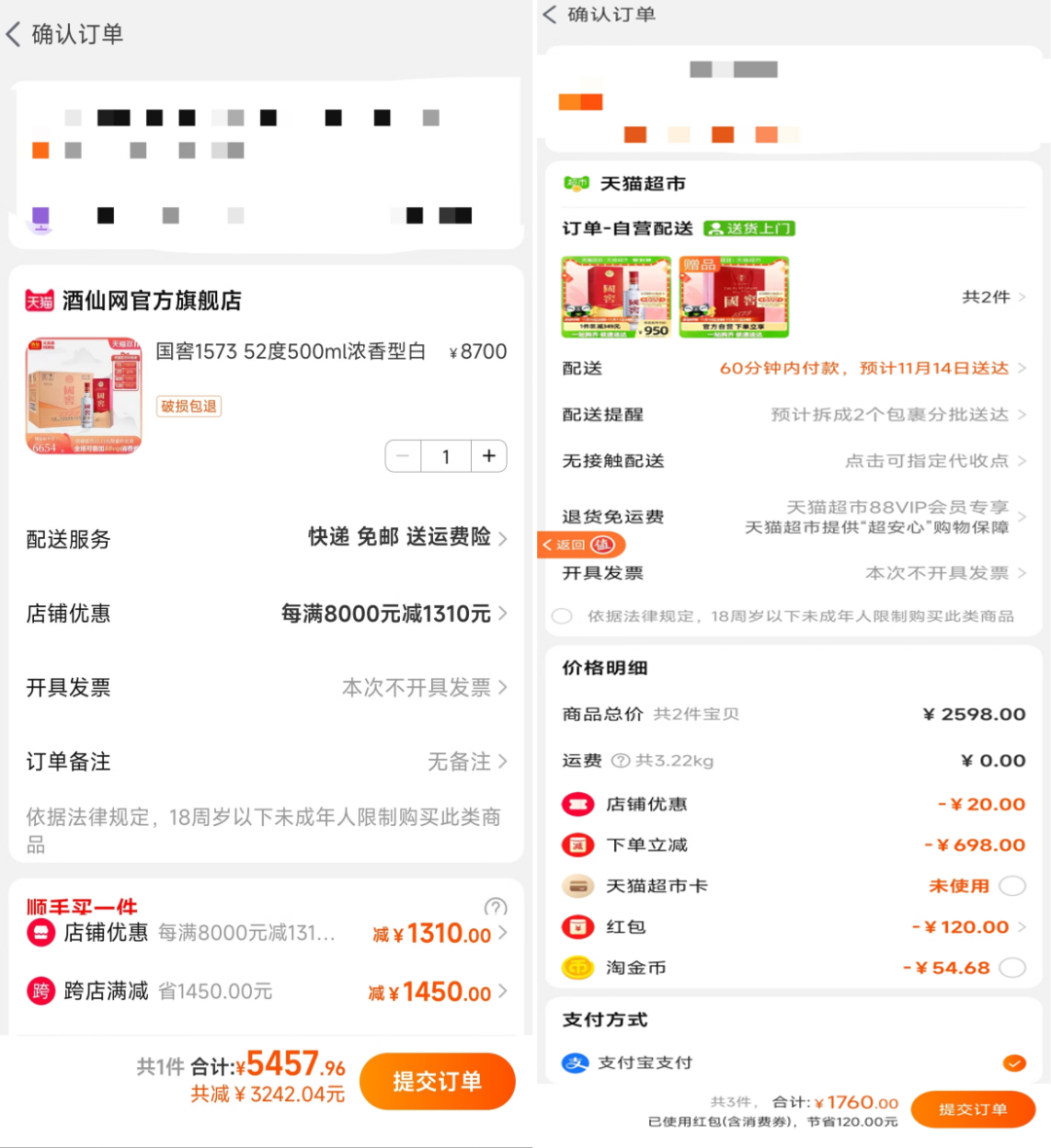 而在电商渠道中,消费逻辑更倾向于普惠。在电商20年的发展中,降价和促销是常态。很多商品结合618、“双11”等大促节点,通过限时、限量等周期性降价的形式让利消费者,拉动销售,也能帮助品牌获得增量发展。在这期间,线上渠道,尤其是自营的线上渠道,实时关注白酒品牌在各个渠道上的价格,动调整相对合理的定价。今年“双11”期间,相关白酒品牌在线上多个渠道的价格均有明显下降,线上渠道都会调整售价,京东、天猫等平台上的高端呈现了较大幅度的让利。