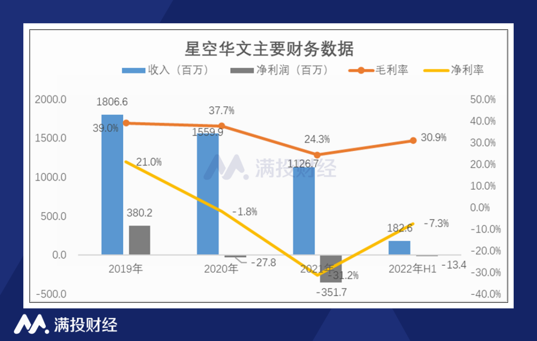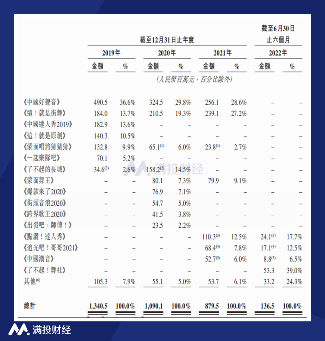 从公司的主要财务数据来看,2019年至2021年,公司实现收入18.06亿元、15.60亿元和11.27亿元,呈逐年下降趋势。公司解释,收入下滑主要与疫情的负面影响以及中国综艺节目市场规模的全行业下降有关,公司超大型综艺节目数量减少,主要节目《中国好声音》、《蒙面唱将猜猜猜》收入下降导致总体收入下滑。2022年上半年,公司实现收入1.83亿元,同比增长18.1%,主要是由于公司在2022年新推出的综艺节目集数较2021年有所增加,综艺节目IP制作、运营及授权产生的收入增长。