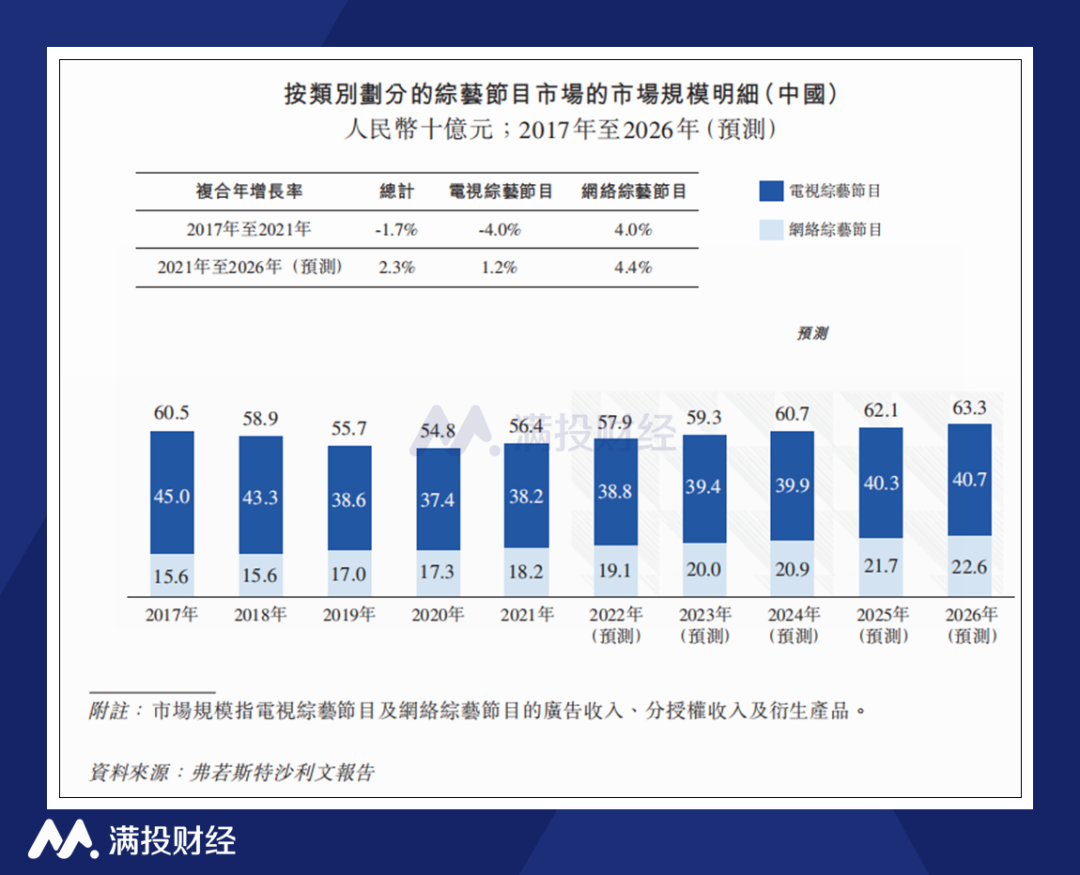 预计未来网络综艺节目市场会比较稳定,而网络综艺节目市场的增长较快,预期于2026年将增加至人民币22.6百万元,2021年至2026年的复合年增长率为4.4%。