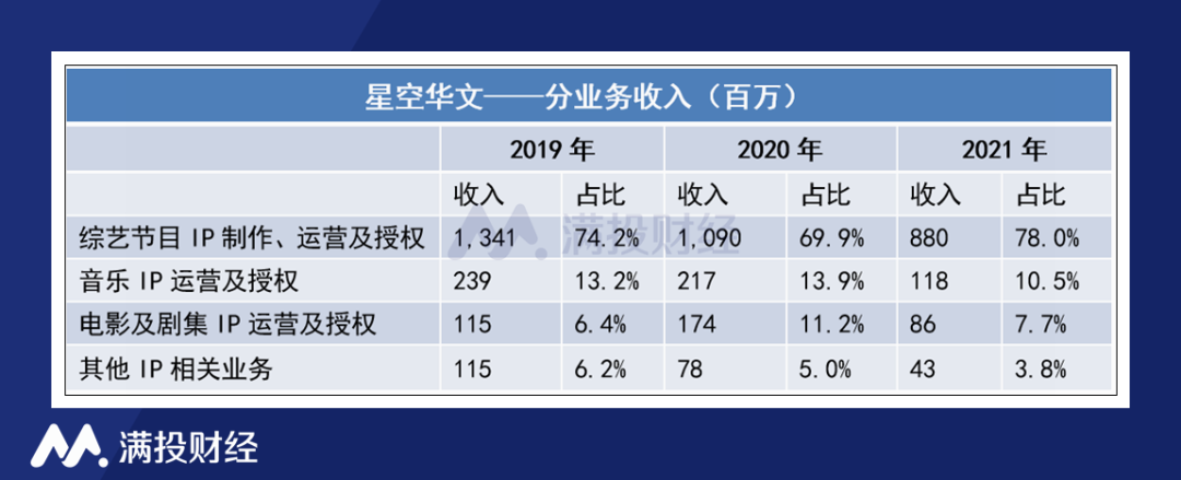分业务来看,公司收入由四个业务分部组成:综艺节目IP制作、运营及授权,音乐IP运营及授权,电影及剧集IP运营及授权,及其他IP相关业务。2021年四块业务的分别实现收入879.5百万元、118.3百万元、86.4百万元和42.5百万元,占总收入比重的78%、10.5%、7.7%和3.8%,综艺节目IP制作、运营及授权是公司最主要的收入来源。