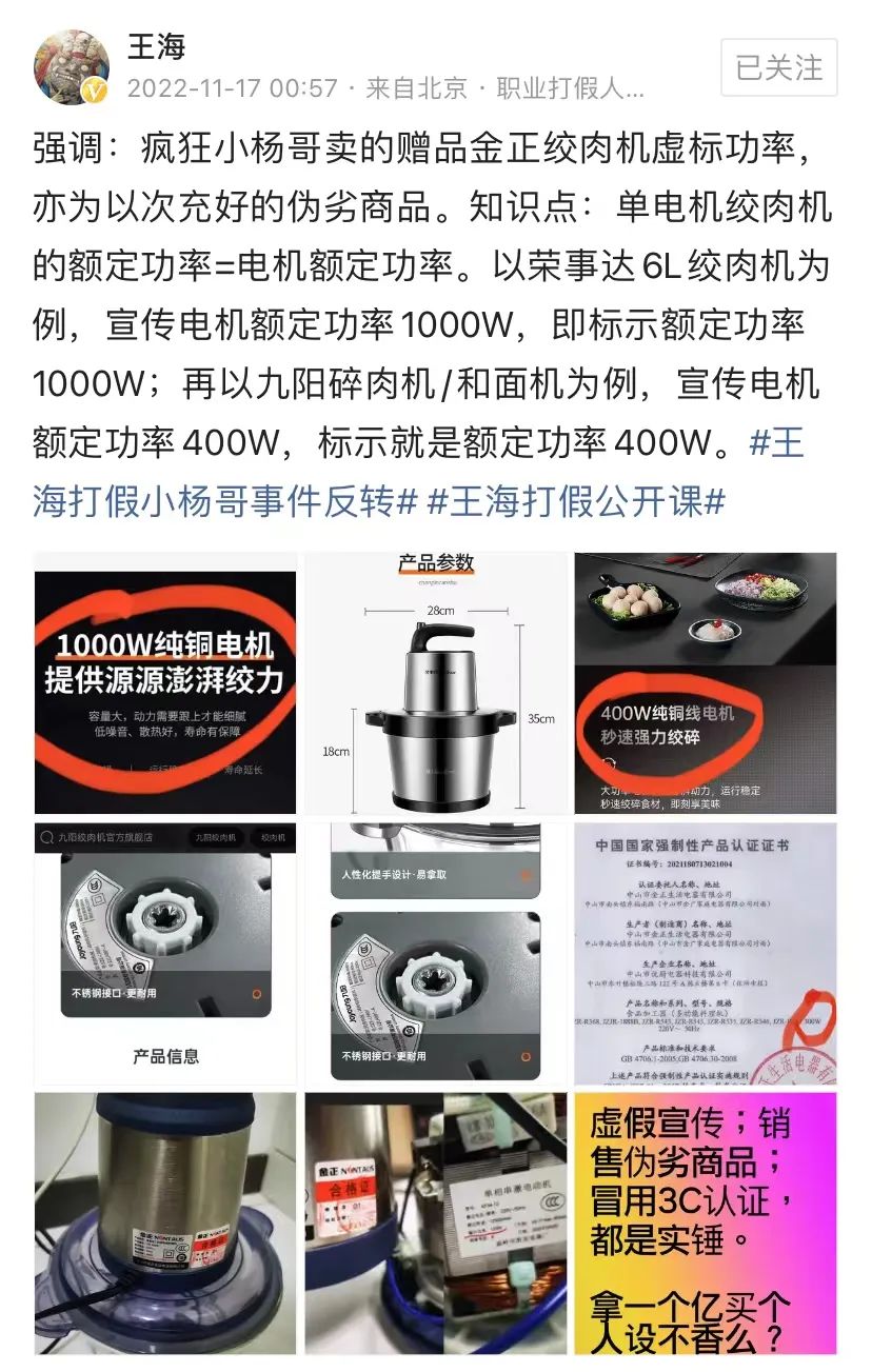 但老话说得好,福兮祸所伏,风头正盛的小杨哥随即就遭到了一记暴击,知名打假人王海近日在网络上爆料,“疯狂小杨哥”直播间内售卖的金正破壁机和绞肉机均为虚标功率。按照399的售价和6.8万的销量计算,如果消费者全部要求退一赔三,那么小杨哥退款赔付的总金额将高达一个亿。
