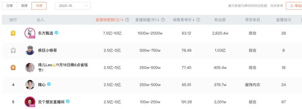 根据蝉妈妈的数据显示,10月抖音达人带货榜中,疯狂小杨哥高居全平台第二,带货金额约在2.5亿~5亿,仅次于东方甄选。